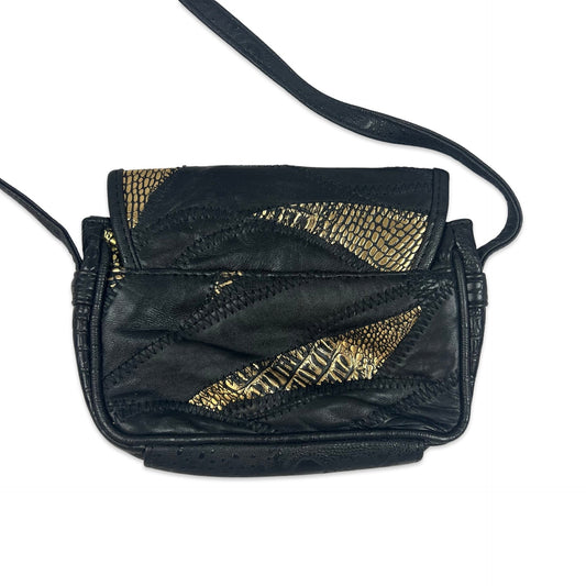 Vintage Patchwork Croc Crossbody Small Leather Handbag Black Gold