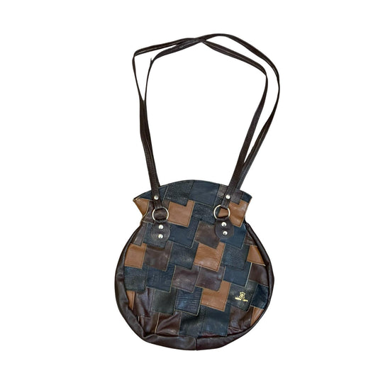 Vtg 70s 80s Black Brown Patchwork Round Boho Leather Handbag