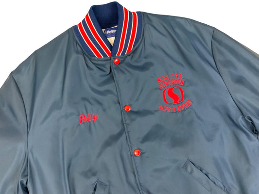 Vtg USA Navy Holloway Norcal Safeway Trucker Embroidered Nylon Varsity Jacket L
