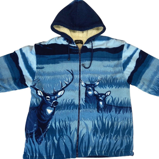 Vintage 90s 00s Blue Sherpa Lined Deer Graphic Print Fleece Jacket L