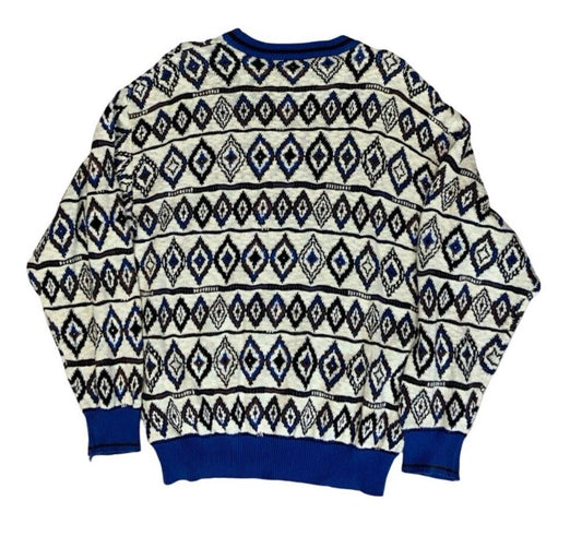VTG 80s 90s HUGO BOSS WHITE BLUE DIAMOND CREW NECK KNIT JUMPER SIZE XL