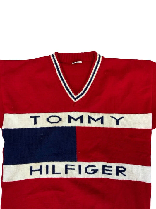 VTG 80s 90s TOMMY HILFIGER RED CHUNKY KNIT V NECK LOGO JUMPER SIZE L