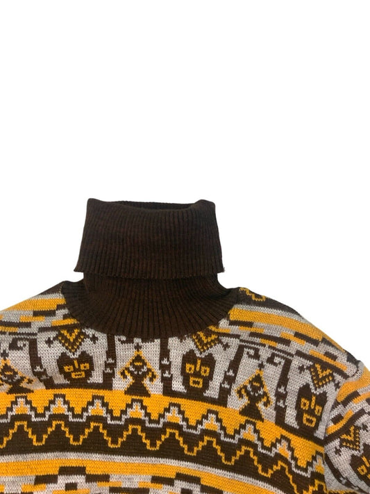 VTG 1970s CRAZY GEOMETRIC TRIBAL PATTERN TURTLE NECK KNIT JUMPER S 38