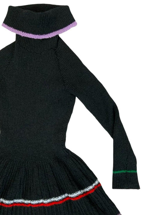 VTG 70S 80s BLACK MULTICOLOUR STRIPE KNITTED ROLL NECK MIDI DRESS SIZE S 8