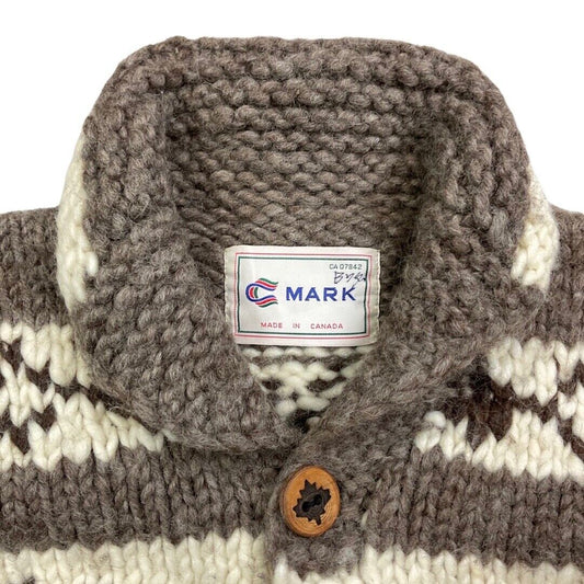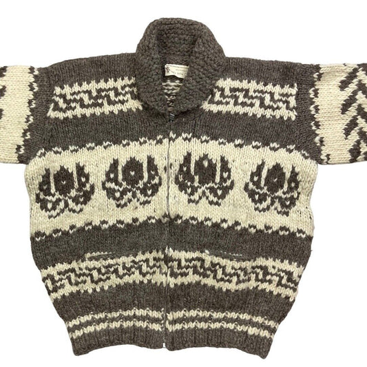 VINTAGE 70s MENS BROWN WOOL COWICHAN GRAPHIC KNIT ROCKABILLY CARDIGAN 44” L