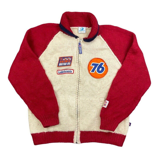 VTG MENS WOOL 76 GAS STATION COWICHAN GRAPHIC KNIT ROCKABILLY CARDIGAN VW 42”