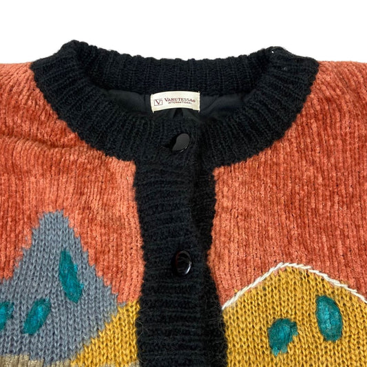 Vintage 80s 90s Black Orange Blue Chenille Graphic Knitted Cardigan 14 M L