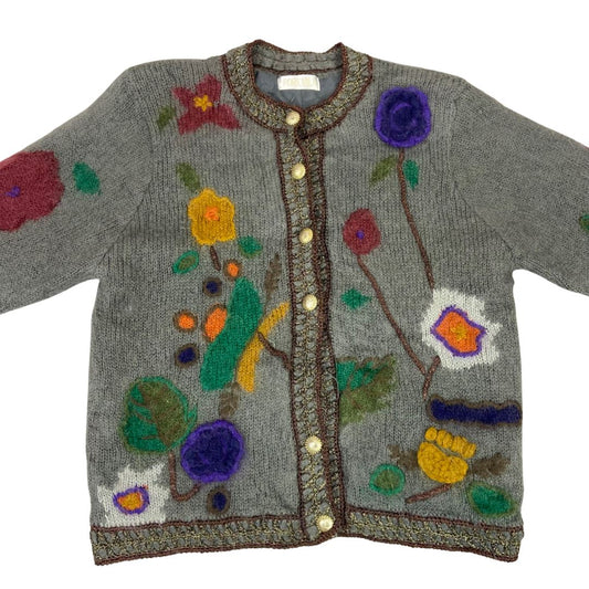 Vintage 80s 90s Grey Embellished Embroidered Floral Graphic Knitted Cardigan M