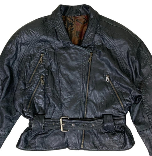 VTG 80s 'ON TIME' BLACK CROP BIKER SHOULDER PAD GRUNGE PUNK LEATHER JACKET M 14