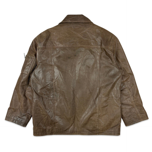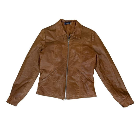 VTG 90s DOES 70s 'PLEASE' BROWN TAN ZIP-UP QUILT LINED MOD LEATHER JACKET S 10