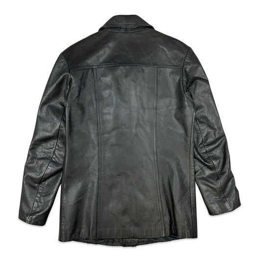 Vtg 90s Black Leather Hooded Leather Jacket Double Breast Toggle Pouch Pocket XL