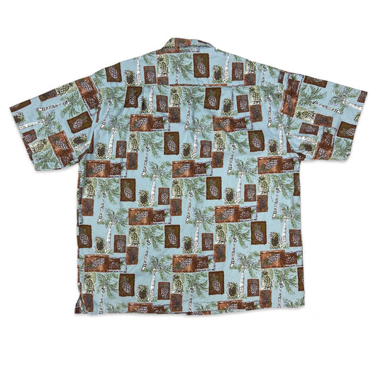 Vintage Y2K Blue & Brown Palm Tree Print Hawaiian Shirt XXL 3XL