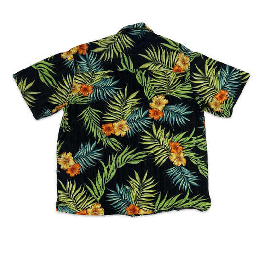 Vintage Botanical Print Black Green & Orange Silk Hawaiian Shirt M L