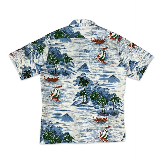 Vintage White Blue & Green Island Print Hawaiian Shirt S M
