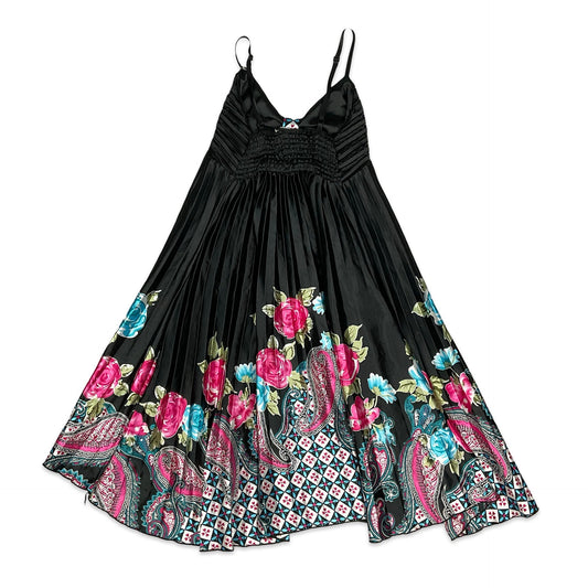90s Black Pink & Blue Floral Pleated Midi Dress 8 10
