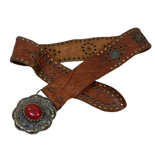 Vintage 00s Y2k Brown Leather Studded Red Stone Metal Belt