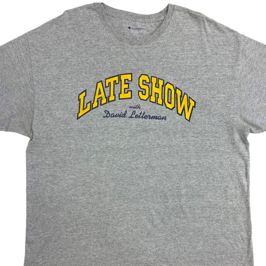 Vintage 90s Grey Yellow Late Show Champion Logo T-shirt XL