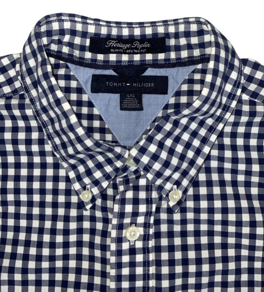 VTG 00S TOMMY HILFIGER NAVY BLUE WHITE CHECK LONG-SLEEVED SHIRT MEDIUM 43"