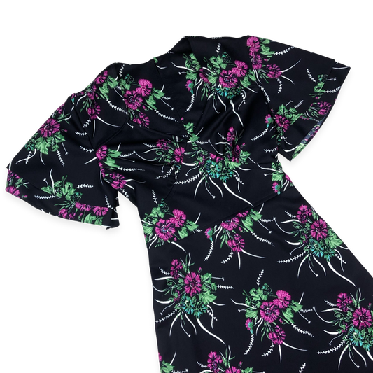Vintage 60s 70s Black Floral Print A-line Dress 12