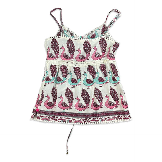Vintage Y2K White Pink Teal Peacock Print Babydoll Spaghetti Top 4 6