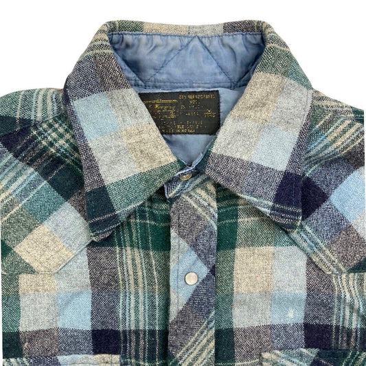 VTG 70s BLUE WOOL PLAID PEARL SNAP WESTERN SHIRT ROCKABILLY HOT ROD 46” (42)