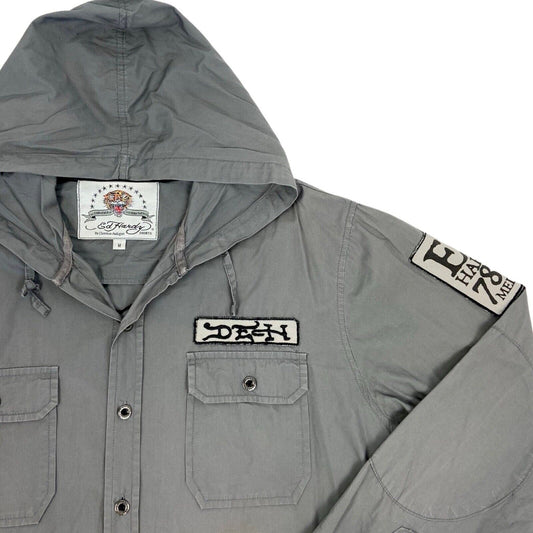 Vintage Y2K Grey Embroidered Skull Heart Ed Hardy Hooded Hooded Shirt M
