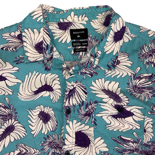 Vintage 90s 'Quicksilver' Blue Purple White Hawaiian Distorted Daisy Short Sleeved Shirt M L