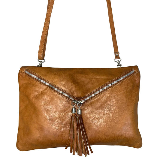 Vtg Light Brown Envelope Genuine Leather Tassel Crossbody Shoulder Clutch Bag