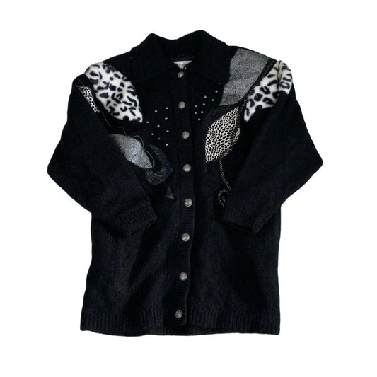 Vintage ‘G. Pisano’ Black Animal Print Beaded Cardigan L 14 16