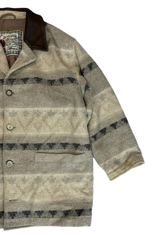 VTG 80s GREY QUILTED AZTEC WOOL LEATHER COLLARED BUTTON UP JACKET SIZE XL