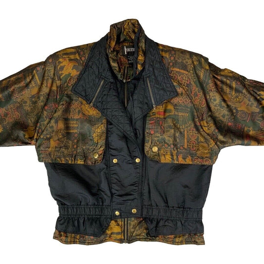 Vintage 80s 90s Black Gold Indications Abstract Print Shell Bomber Jacket XL