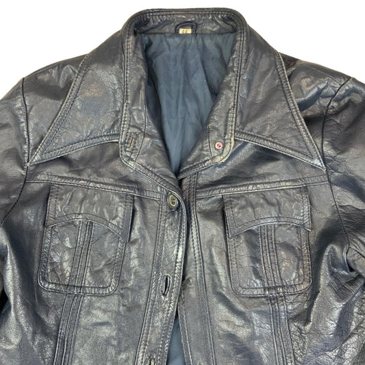 VTG 70s UNISEX BLUE LEATHER JACKET COAT BLAZER BIG COLLARS DISCO MOD 34” XS