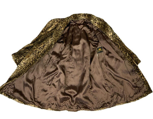 VTG 80s LEOPARD ANIMAL PRINT BROWN BLACK FAUX FUR SWING COAT SIZE L