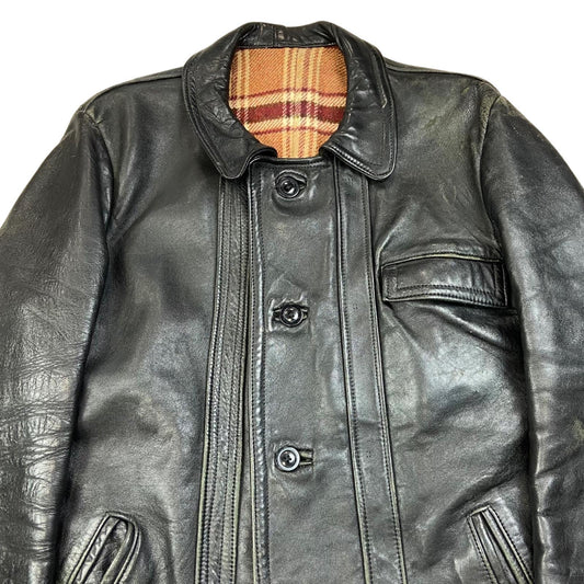 VTG 1970s HEAVY LEATHER JACKET WOOL BLANKET LINED COAT BUTTON DOWN BIKER 38” S