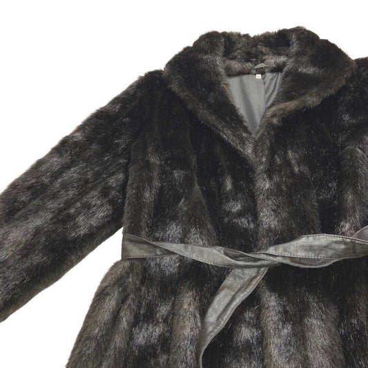 Vintage 70s 80s Black Belted Long Faux Fur Coat 16 18 L