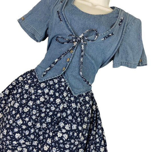 Y2K 90s Alix Taylor Petite New York Light Denim Waistcoat Style Blue Floral Skirt Maxi Dress XS 10