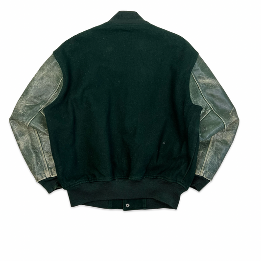 Vintage Forest Green Distressed Varsity Bomber Jacket L 14