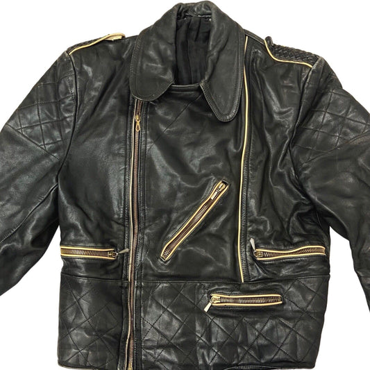 Vintage 60s Black Biker Spoon Collar Quilted Leather Jacket M