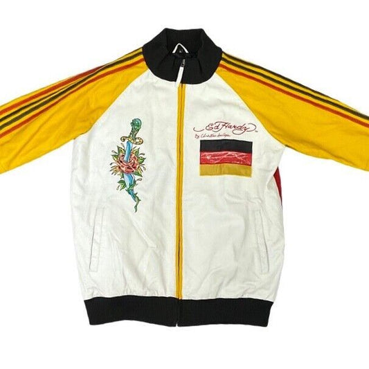 Vintage Y2K Super Rare White Yellow Embroidered Ed Hardy Leather Bomber Jacket L