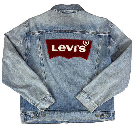 LEVIS PREMIUM BIG E RED TAB TYPE 3 TRUCKER DENIM JACKET WITH CHENILLE PATCH 36”S