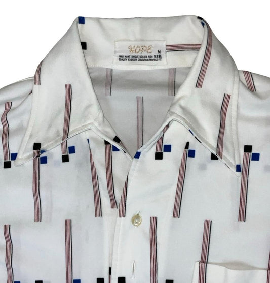 VTG 70s 'HOPE' WHITE RED BLUE GEOMETRIC PATTERN DAGGER COLLAR GOLF POLO SHIRT S