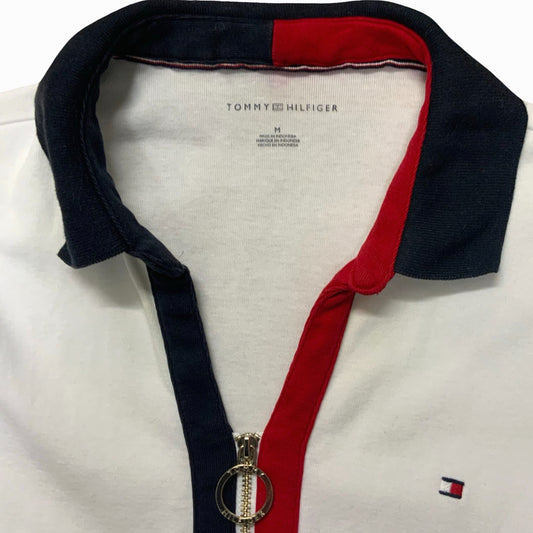 VTG 'Tommy Hilfiger' White Blue Red Interlock Zip Regular Fit Polo Shirt UK 10