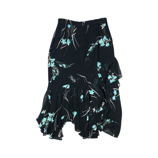 Vintage 90s Y2K Floral Print Black Asymmetric Hem Midi Skirt 10