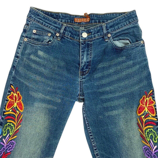 Vintage 90s Y2K Blue Denim Flared Mid Rise Embroidered Floral Jeans 8 S