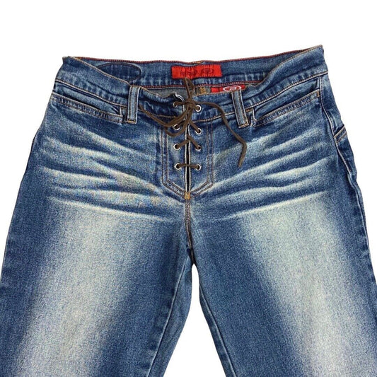Vintage 90s Y2K Blue Denim Flared Lace Up Detail Low Rise Jeans 8 10 S