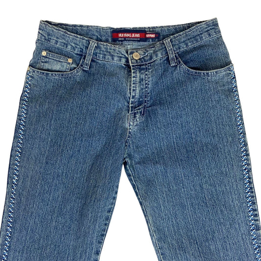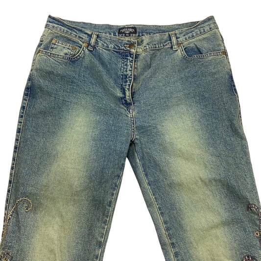 Vintage 90s Y2K Blue Washed Denim Embroidered Flared Mid Rise Jeans 12 14 M