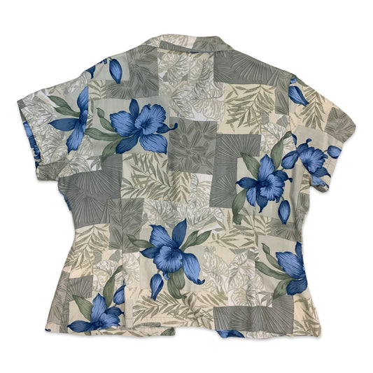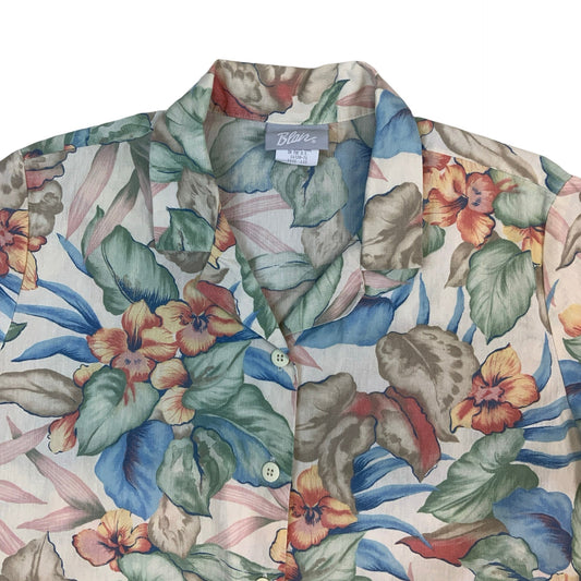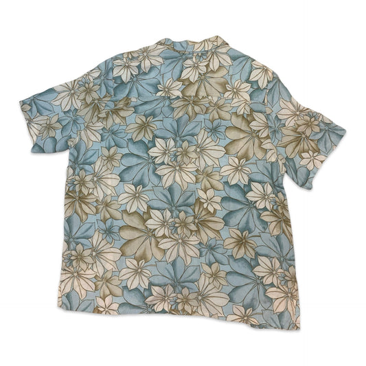 80s Blue & Beige Floral Hawaiian Shirt 14 16