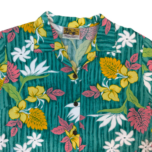 90s Teal Yellow & Pink Floral Hawaiian Shirt 8 10 12