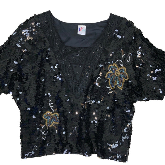 Vintage 80s Boxy Oversized Sequin Blouse Black 14 16