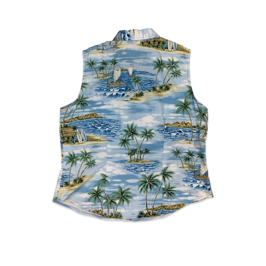 90s Blue Button Up Hawaiian Sleeveless Blouse 10 12